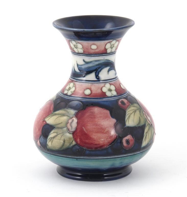 'Pomegranate' a Moorcroft Pottery banded vase, designed by William Moorcroft, painted with a band of pomegranate design below bands of flowers and a band of scrolling foliage, in shades of blue, green, pink and purple on a blue ground impressed marks, painted blue signature 15.5cm. high