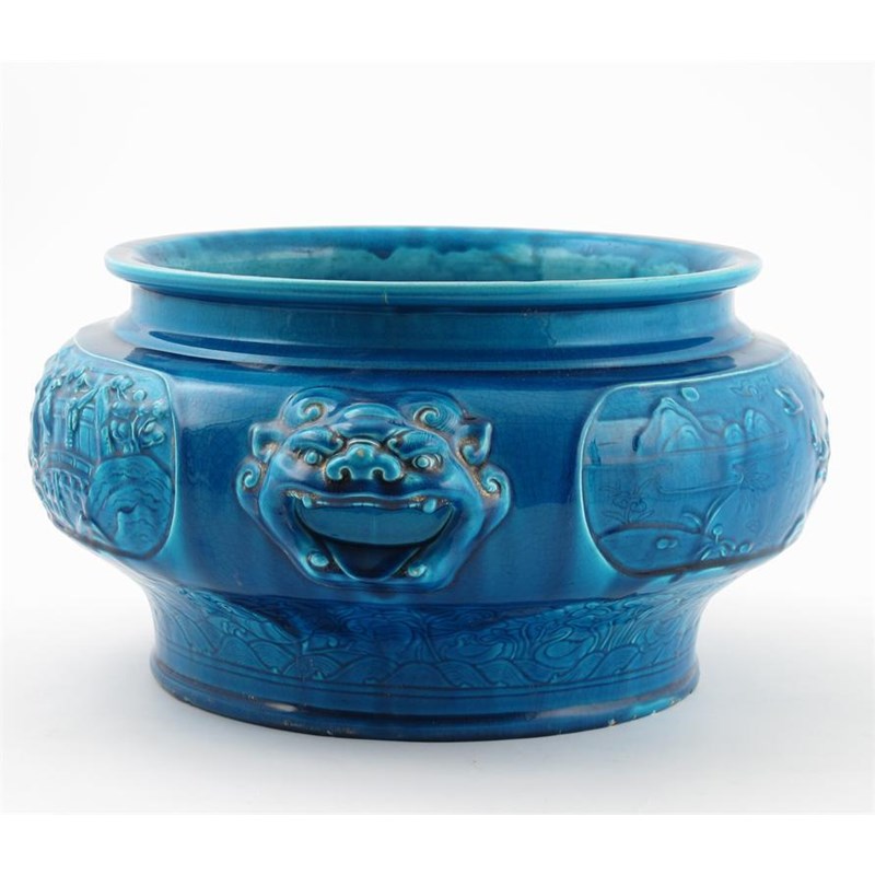 A Longwy Pottery jardiniere, ovoid form, modelled in low relief with oriental panels, and mask handles impressed marks, chips 41cm. diam.