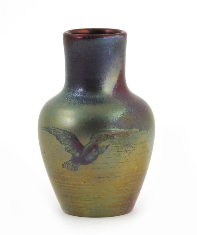 A Delphin Massier lustre vase, shouldered form, decorated with a bird flying, in lustre on a red lustre ground painted DM V mark 13cm. high