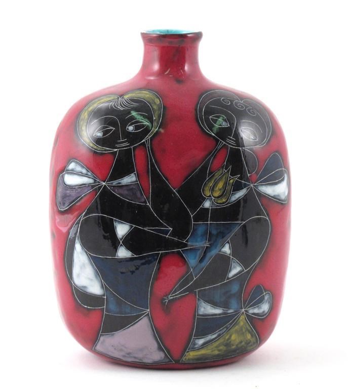 A Fantoni vase, painted with a courting couple, in colours on a red ground painted Fantoni Italy, hairline to top rim 17cm. high