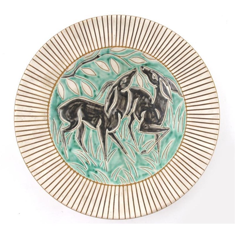 An Eslau Pottery charger, incised and painted with two deer to the well, the rim with sgraffito bands painted marks, 34cm. wide