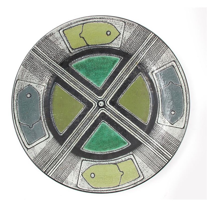 A large Kahler Keramik, Danish pottery charger signed Gete, painted to the rim with stylised fish, in green on a black and white geometric ground, and another smaller impressed and incised marks, retailers paper label 41.5cm. diam.