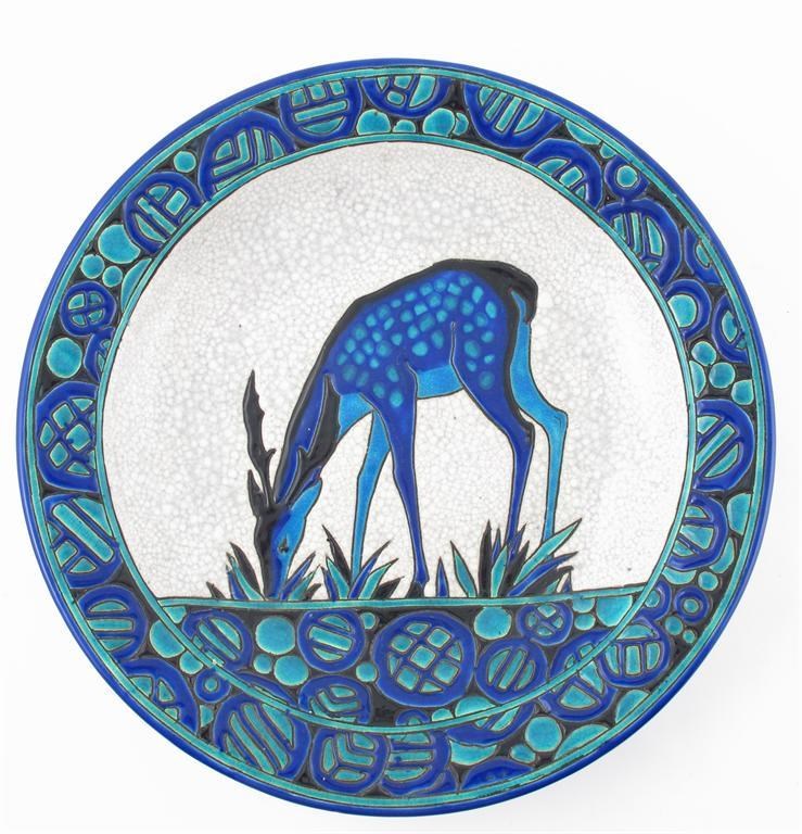 A Keramis Pottery charger designed by Charles Catteau, decorated to the well with a deer grazing, the rim a geometric border glazed blue and turquoise on a cream crackled ground printed marks, facsimile signature 37cm. diam.