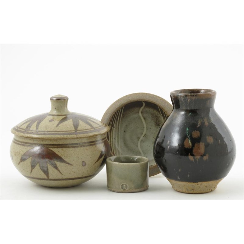 a stoneware vase, covered in a tenmoku glaze, a bowl and cover, a coaster painted with willow tree design and a celadon pot all impressed marks vase 11.5cm. high