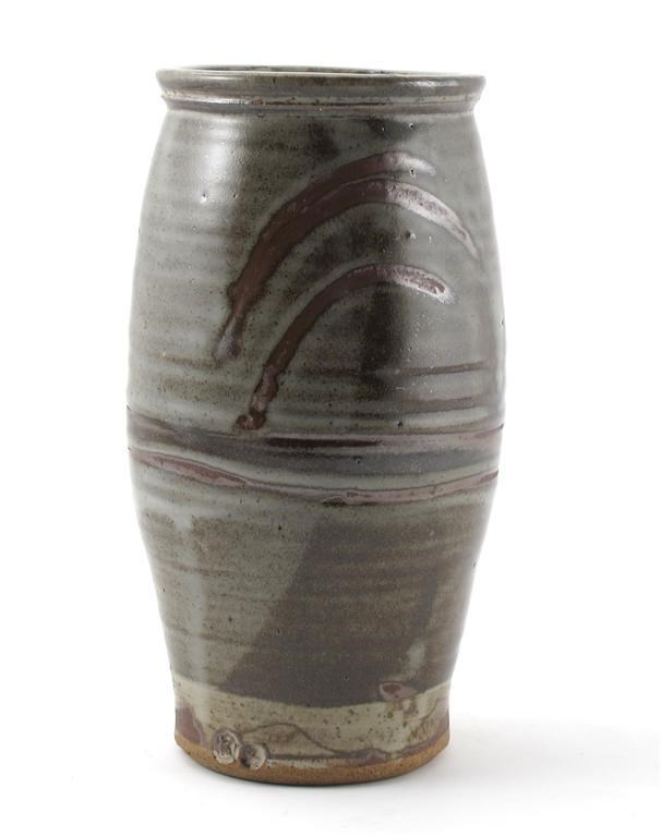 a Leach Pottery stoneware vase, swollen cylindrical form, painted with tenmoku brush design over ash impressed seal marks 26cm. high