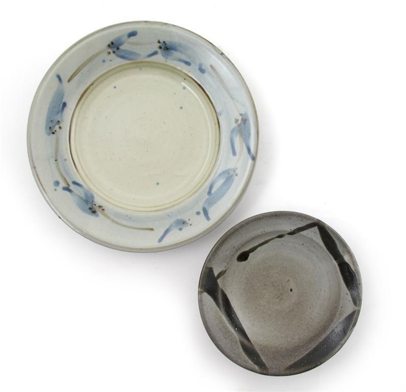 a stoneware shallow bowl decorated in tenmoku with brushstrokes over silver-grey glaze, and another plate impressed seal marks 15cm. diam.