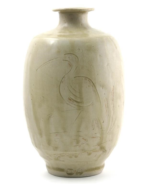 an Ainstable stoneware vase covered in a streaked off-white glaze with incised wading bird impressed seal marks 24cm. high
