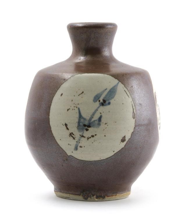 an Ainstable stoneware vase, shouldered form, covered in a tenmoku glaze over ash, with simple blue brushed grass motif impressed seal marks 19cm. high