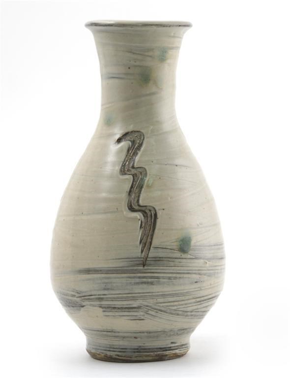 an Ainstable stoneware vase covered in a cream slip with incised design and painted green spots impressed seal marks 25cm. high