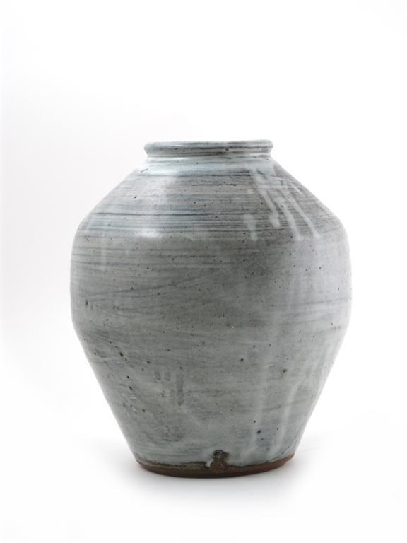 a large Leach Pottery vase, shouldered form covered in a silver-grey slip impressed seal marks 32cm. high