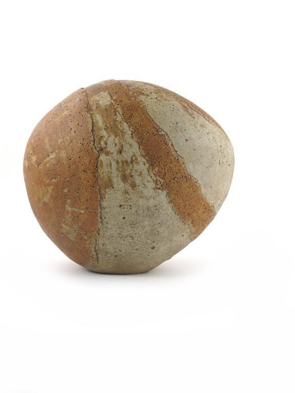 a large ovoid stoneware vase, with incised bands, glazed ochre and silver-grey incised AW, 39cm. high