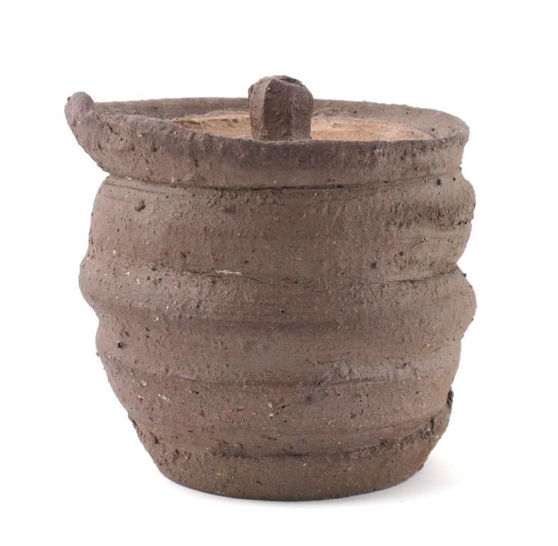 a jar and cover, rough pitted finish glazed brown, impressed seal marks 15cm. high