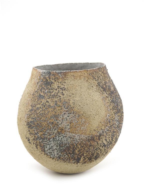 a hand-built stoneware vase, with brown glaze decoration, the interior glazed mushroom unsigned 17cm. high