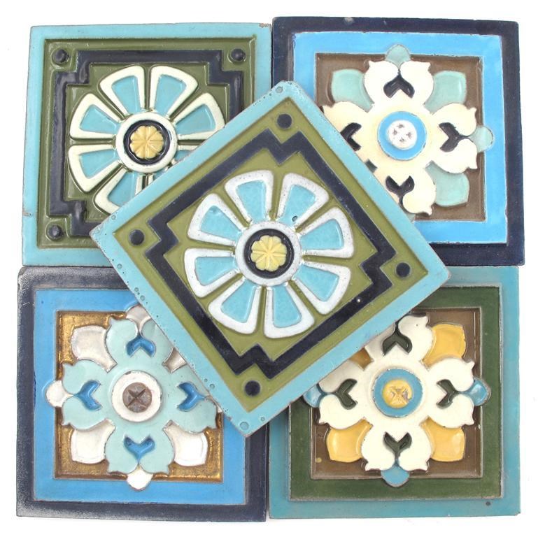 Five continental pottery majolica tiles, circa 1870s, each moulded in low relief and glazed in colours, unsigned 15cm. square