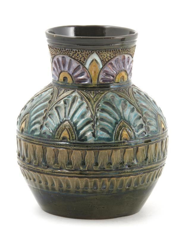 A Linthorpe Pottery vase designed by Dr Christopher Dresser, ovoid with everted rim, with incised bands of stylised foliage in shades of green, pink, blue and sand on an olive ground impressed marks, incised signature, restored neck 17cm. high