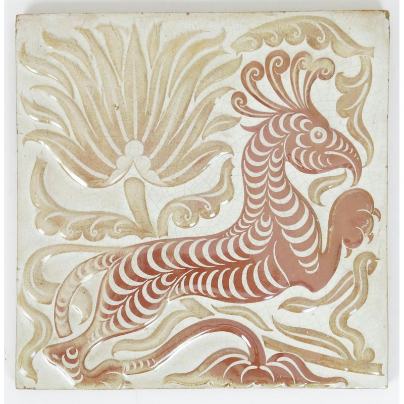 A William De Morgan Sands End Pottery tile designed by Halsey Ricardo, modelled in low relief with a leaping mythical beast in ruby lustre impressed mark 22.5cm. square