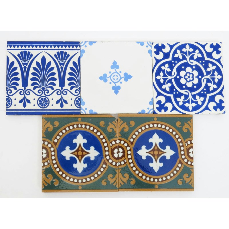 A Prosser's Patent Minton & Co tile designed by A.W.N Pugin, printed in pale blue with simple foliate panel, on a white ground, two other Minton's tiles and two Maw & Co encaustic tiles impressed marks, minor rim chips, 15cm. square