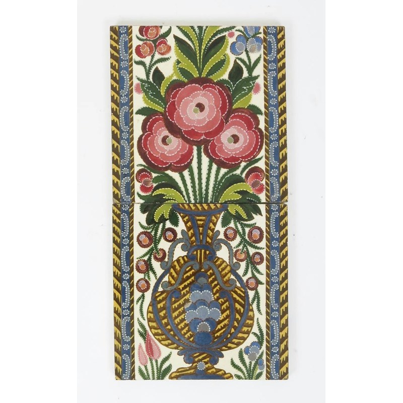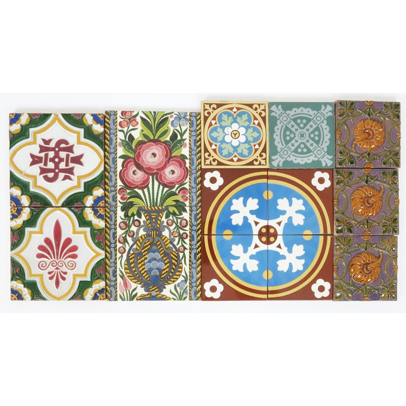 A pair of Minton Hollins & Co tiles, handpainted with an simulated embroidered vase of stylised flowers, in colours, a Godwin four tile panel, and ten other tiles impressed marks, 15cm. square