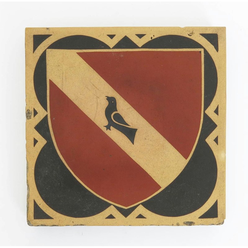 A Minton's encaustic tile designed by A.W.N Pugin for St Augustine's Ramsgate, decorated with a black bird in a red shield, martlett emblem unsigned 15.5cm. square