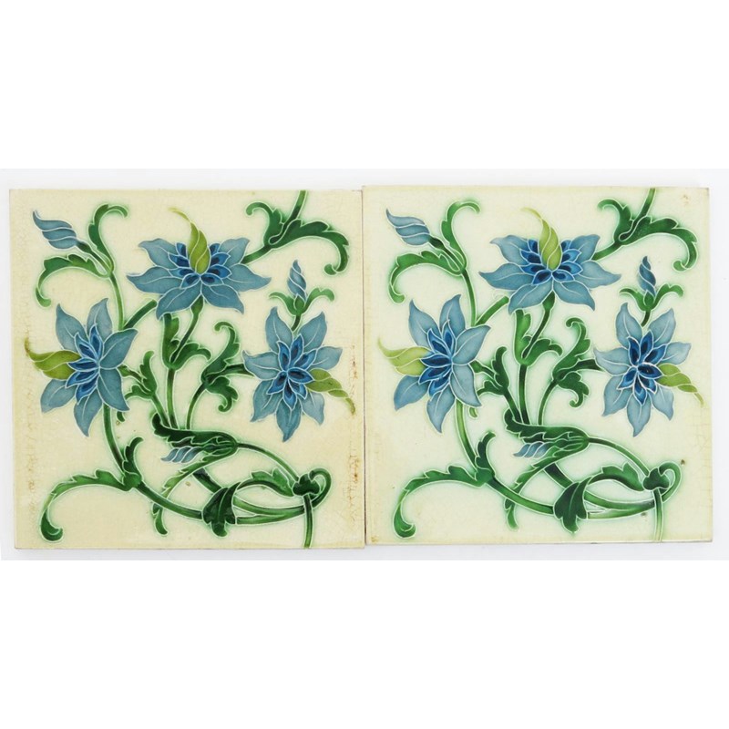 A pair of Pilkington's tiles designed by Lewis F Day, dust pressed with a flower spray in shades of blue and green on a cream ground impressed P mark 15cm. square