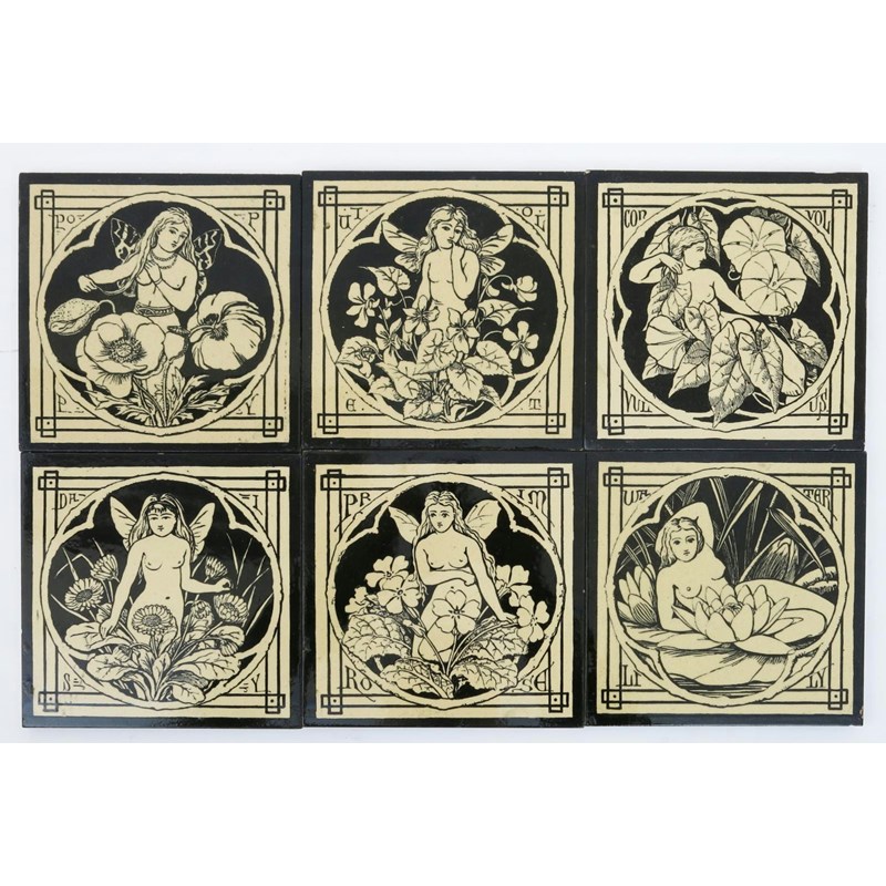 A set of six Minton's Spirit of the Flowers tiles designed by C.O.Murray, printed in black on a cream ground with flower fairies impressed marks, 15cm. square
