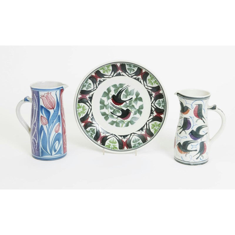 a stoneware plate, painted with two birds amongst foliage to the well, the rim a frieze of pairs of birds, in red, black and green on a white ground, and two tall jugs painted monograms 29cm. high