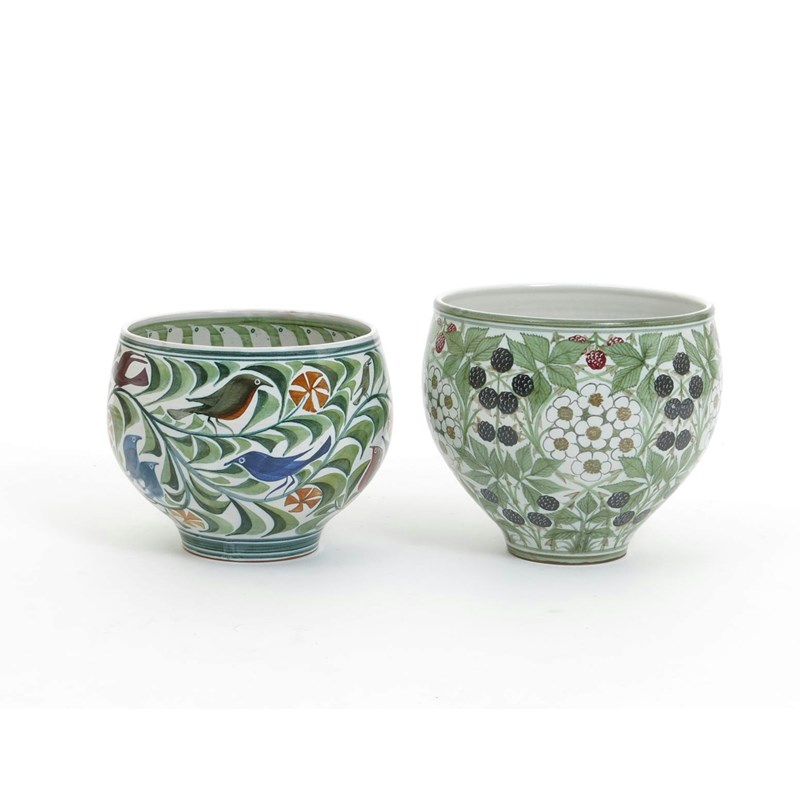 a stoneware bowl painted with blackberry fruit and flowers, in shades of black, red, and green on a white ground, and another bowl painted with birds painted monogram 17cm. high