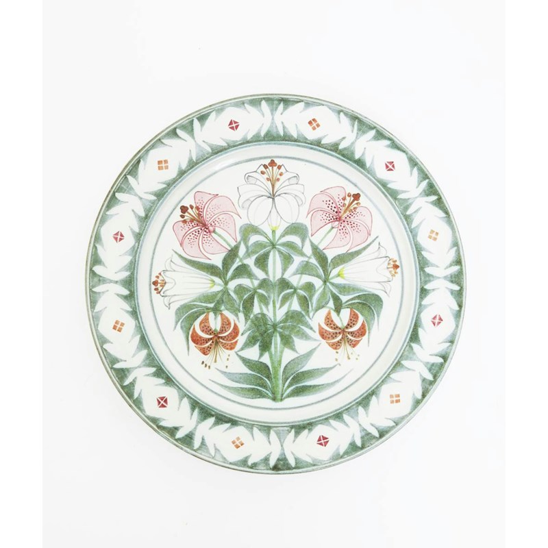 a stoneware charger, painted to the well with lilies, in shades of pink, white, yellow and green on a white ground, painted monograms 37cm. diam.