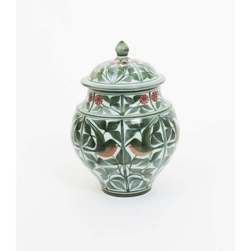 a stoneware jar and cover, painted with a frieze of robins amongst foliage in shades of red and green on an off white ground, the cover with stylised flower stems painted monograms 26.5cm. high