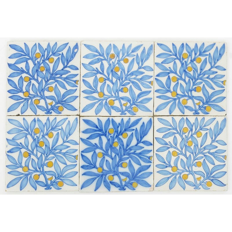 Eight tin-glaze tiles in the manner of Morris & Co, decorated with a bough of berried foliage in blue and yellow on a white ground, unsigned, minor rim chips, 15.5cm. square