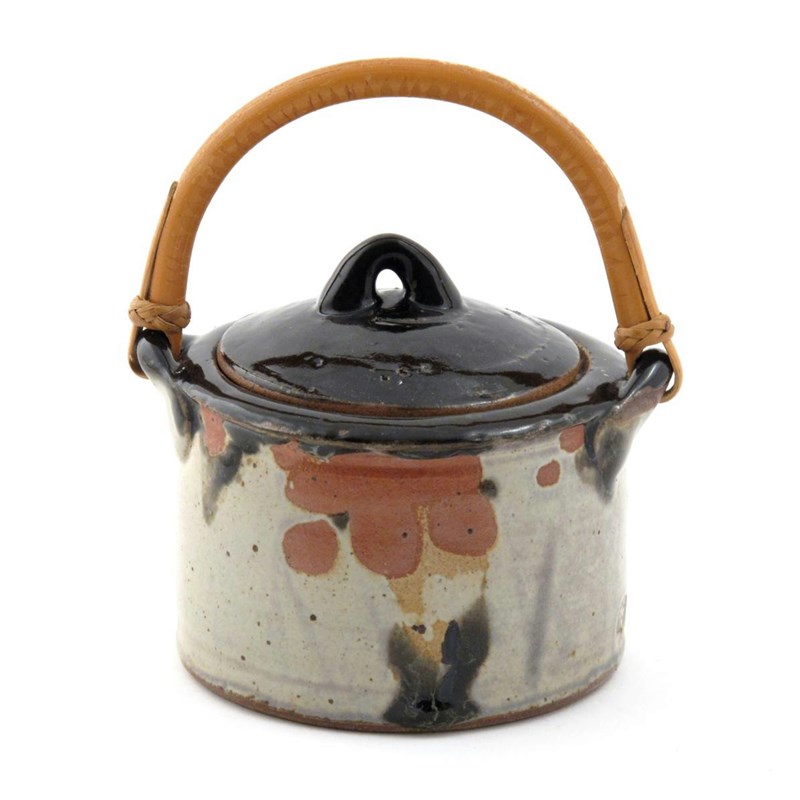 a stoneware pot and cover with bamboo handle, painted with iron-red flowers on a buff ground, with tenmoku rim and cover, impressed seal mark, minor glaze loss, 12cm. high