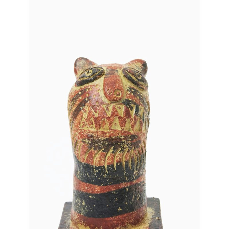 a stoneware Tiger box and cover, glazed in colours impressed seal mark, paper exhibition number 15.5cm. high