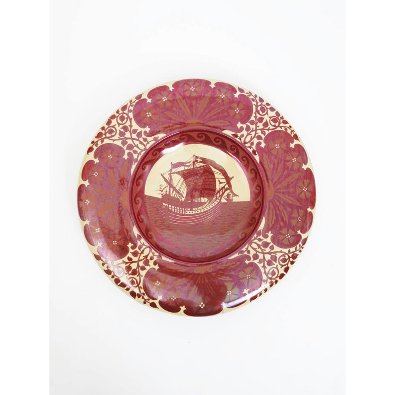 A fine Maw Jackfield charger, painted to the well with a galleon at full sail, another sailing into the distance, the rim a border of carnation flowers, in a rich ruby lustre on cream ground, the three hanging holes modelled as bearded mask, painted Camel MJ mark, chips to rim, 47cm. diam.