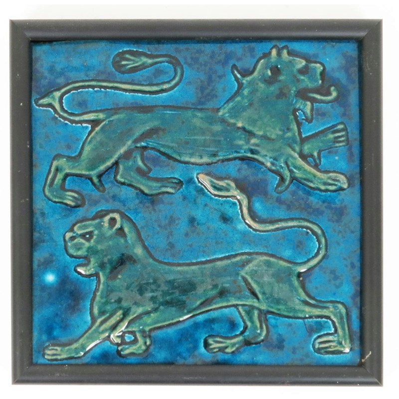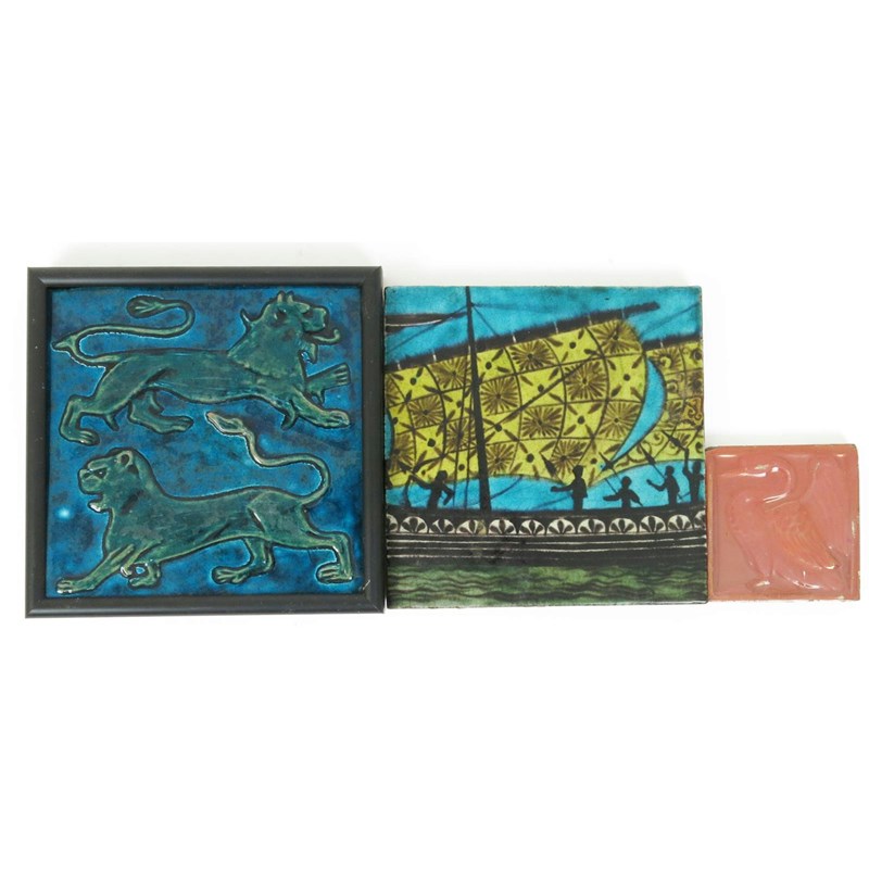 A William De Morgan Poole Architectural tile, painted with the mid section of a sailing vessel, in blue, green and yellow, a William De Morgan Raised Lion tile and a small raised bird tile impressed marks, damages 15cm. square