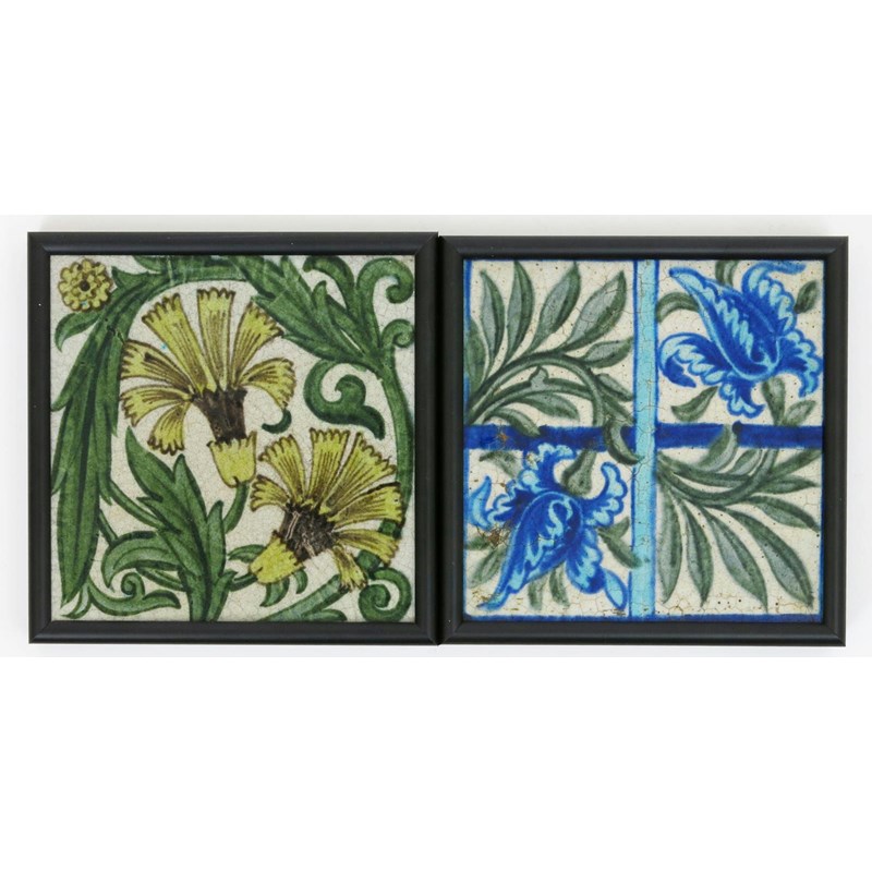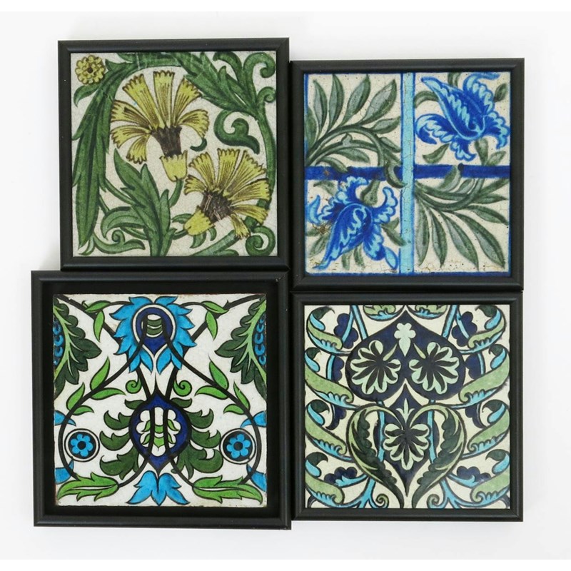 A William De Morgan Merton Abbey Carnation tile, painted in shades of yellow and green on a white ground, a William De Morgan trellis tile and two other tiles impressed marks, 15cm. square