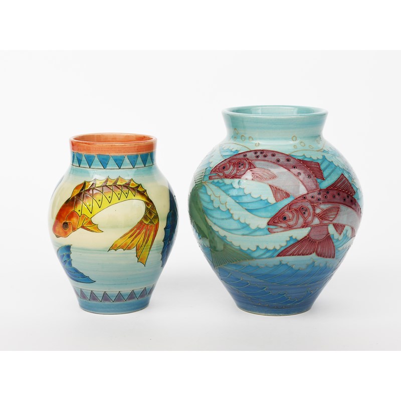 'Blue Fish' a Dennis China Works Trial vase designed by Sally Tuffin, dated 1999, shouldered, ovoid form with collar neck, painted in colours on a pale blue ground, and another smaller 'Fish' baluster vase, impressed and painted marks, 20cm. high (2)