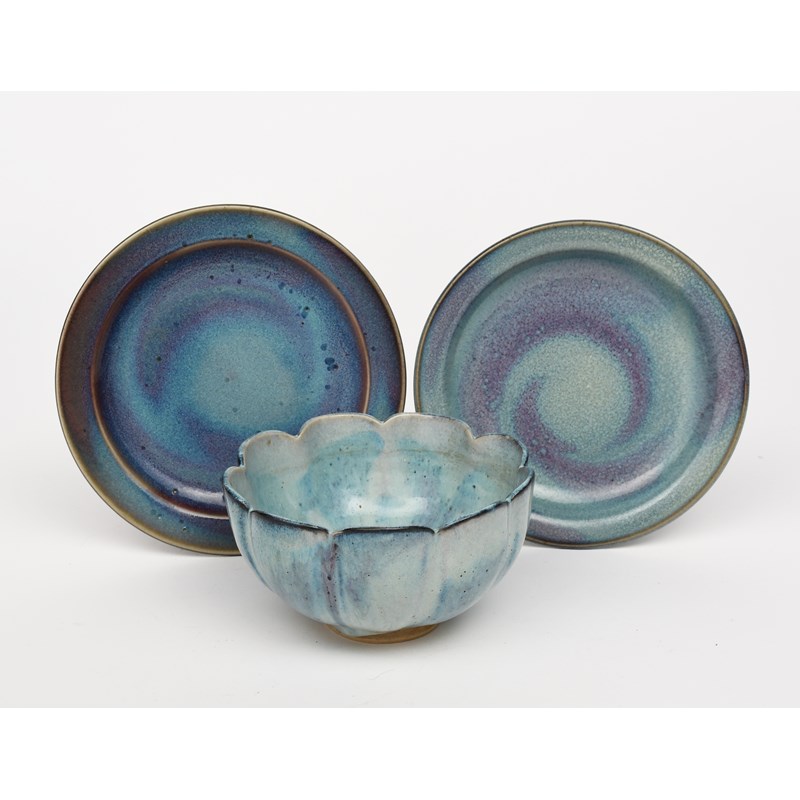 a stoneware lotus flower bowl, dated 1938, covered to the foot with a Chun glaze, and two plates by Charles Vyse covered in a Chun glaze,