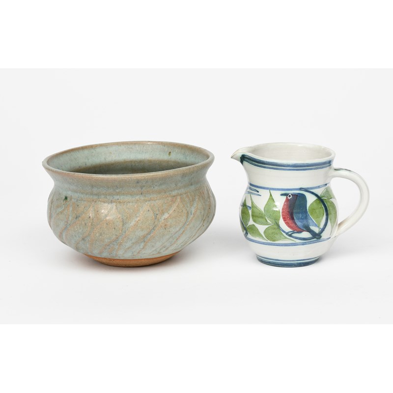 a stoneware bowl with cut decoration, covered to the foot with an ash glaze, a small tin-glazed jug by Laurence McGowan, and a pottery dish in the manner of Ewen Henderson,