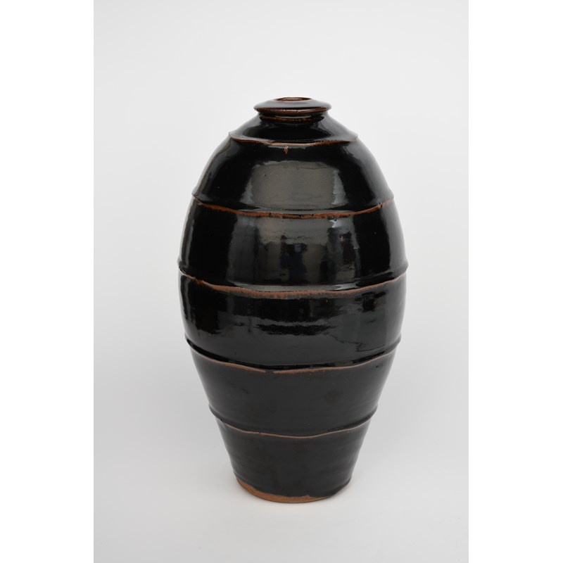 a ribbed stoneware bottle, covered to the foot in a rich tenmoku glaze