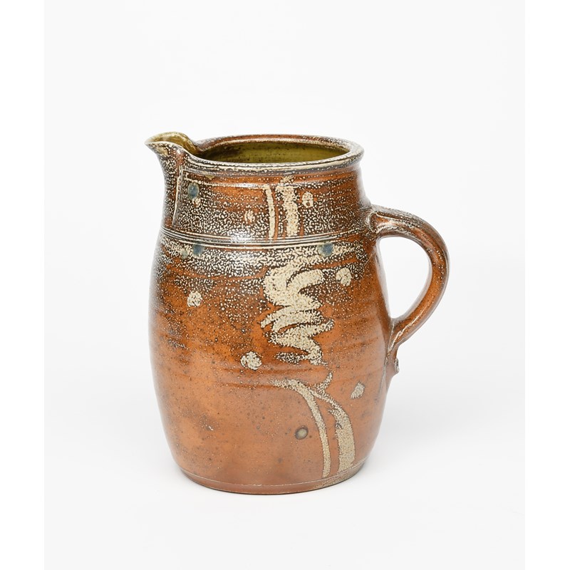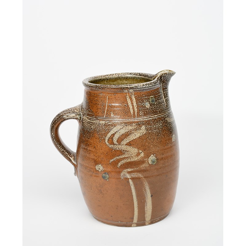 a large salt-glazed stoneware jug, swollen cylindrical form, simple brushed decoration
