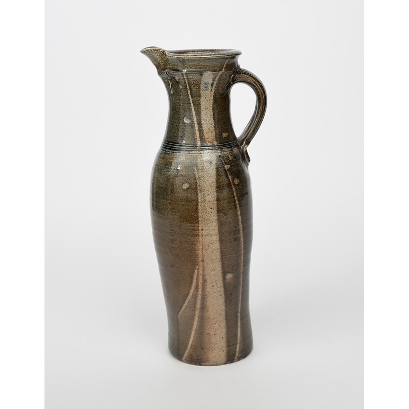 a tall stoneware ewer, swollen cylindrical form with applied handle, simple brushed design in mushroom and ochre