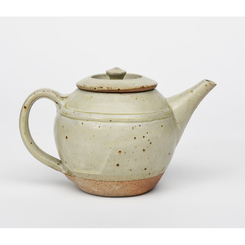 a stoneware teapot, covered in a pale ash glaze with speckles,