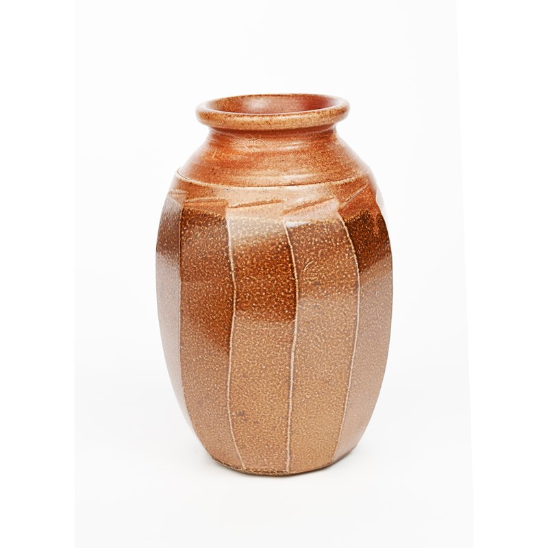 a salt-glazed cut-sided stoneware Lily jar, covered in a rust coloured glaze,
