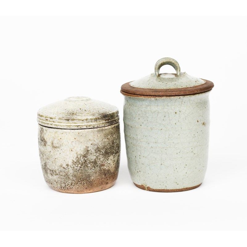 a salt-glazed stoneware caddy and cover, and a stoneware sugar cannister and cover covered to the foot with a blue ash glaze,