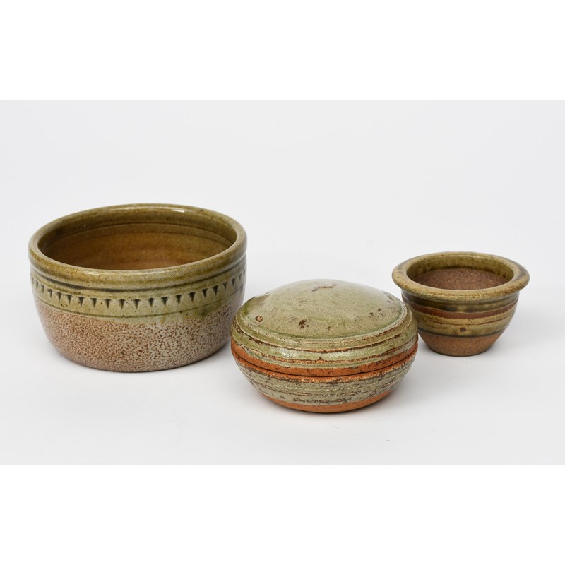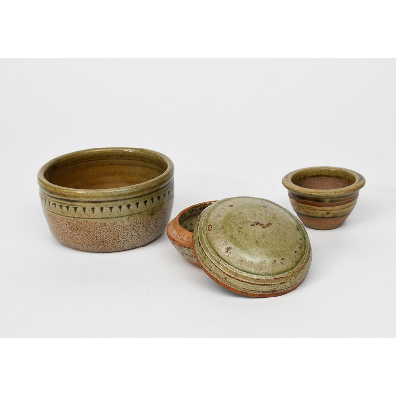 a stoneware box and cover, covered in an ash glaze, a large salt-glaze stoneware souffle dish with chatter band and a small stoneware salt