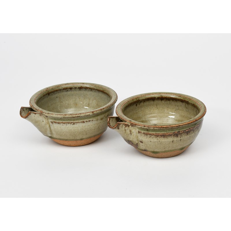a pair of stoneware small batter bowls covered in an ash glaze to the foot,