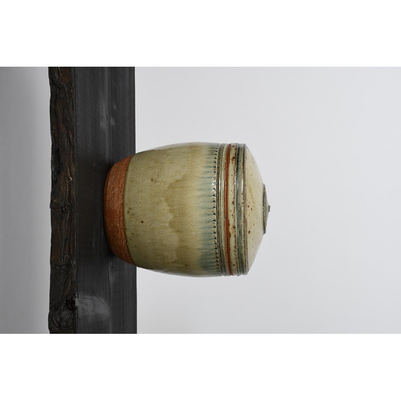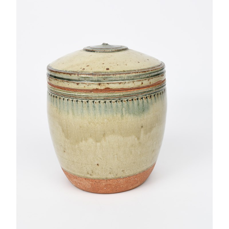 a large stoneware caddy and cover with chatter band, covered in an ash glaze