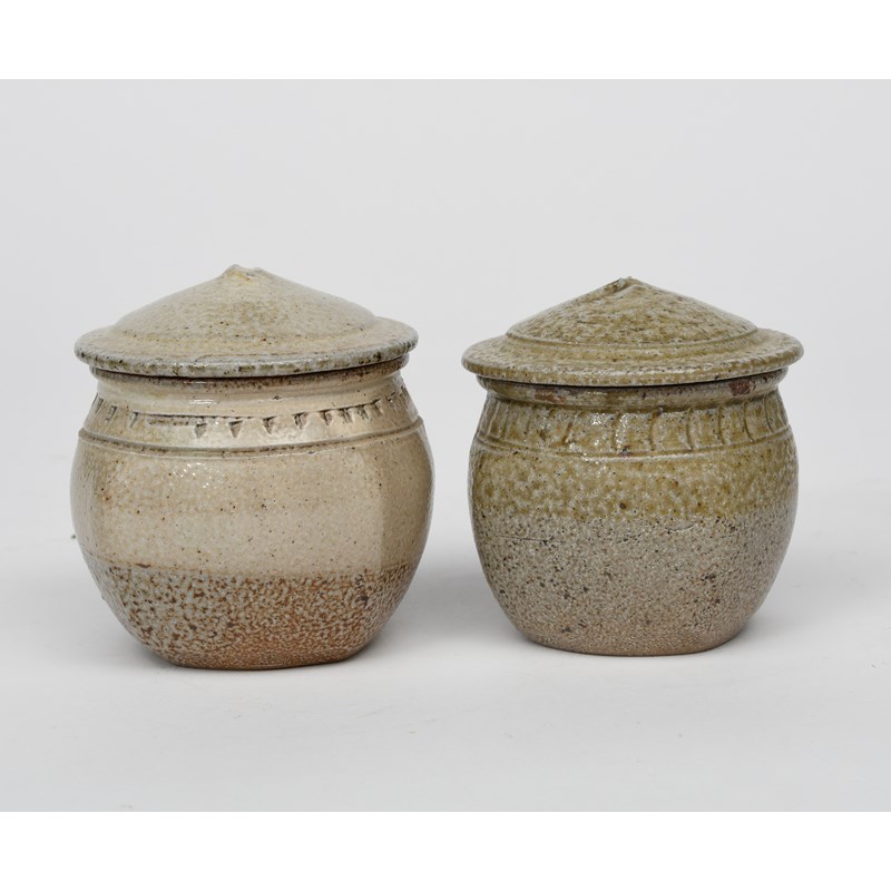 a salt-glazed stoneware little square jar and cover, with chatter band, and another similar,
