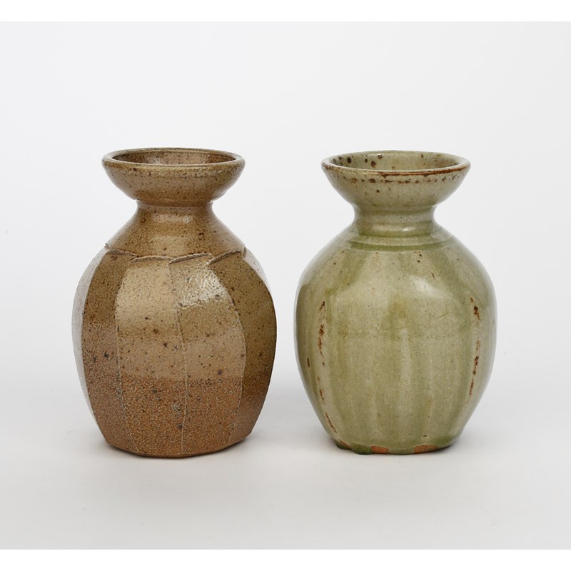 a cut-sided salt glaze stoneware flower vase, and another stoneware flower vase covered in an ash glaze,