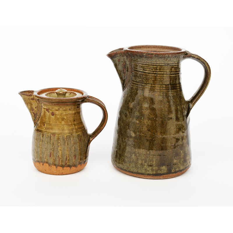 a stoneware coffee pot and cover, with incised comb decoration, covered in an ash glaze, and a larger coffee pot